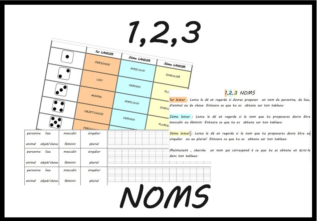 Si on ne souhaite pas utiliser de dés, il suffit de faire des papiers de 3 couleurs différentes pour le type de nom, le genre et le nombre.