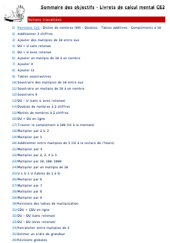Cela représente 1 livret de calcul mental par semaine : le sommaire des compétences travaillées se trouve dans les images de présentation.