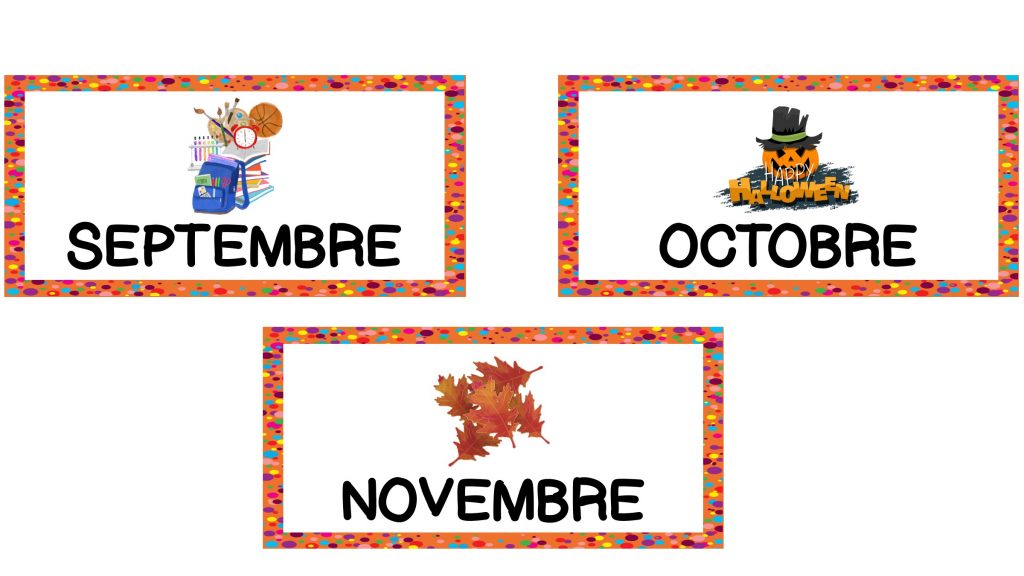 – 12 cartes mois de l’année : images événements mensuels + écriture du mois en cursif (GS)