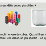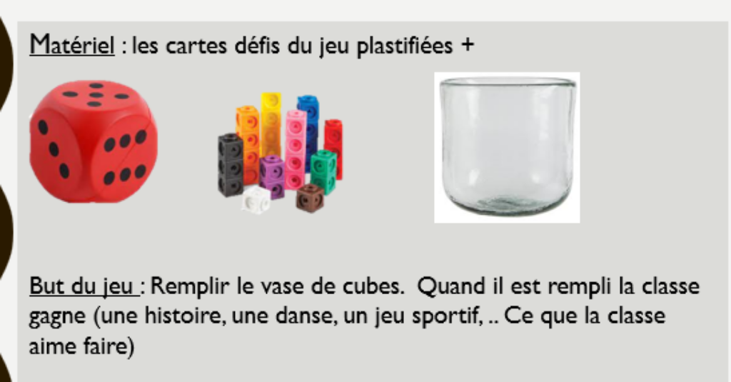 Un dé, des cubes de couleur vert, bleu, jaune, rouge, un petit pot transparent.