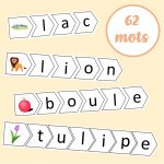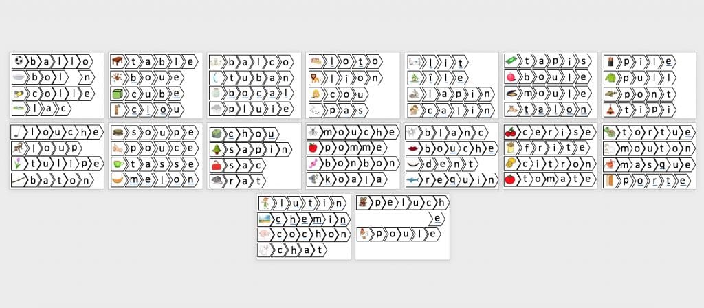 - Chaque mot est découpé en étiquettes : 1 étiquette avec l’image du mot à écrire + des étiquettes lettres permettant l’écriture du mot.