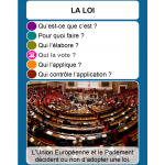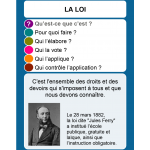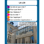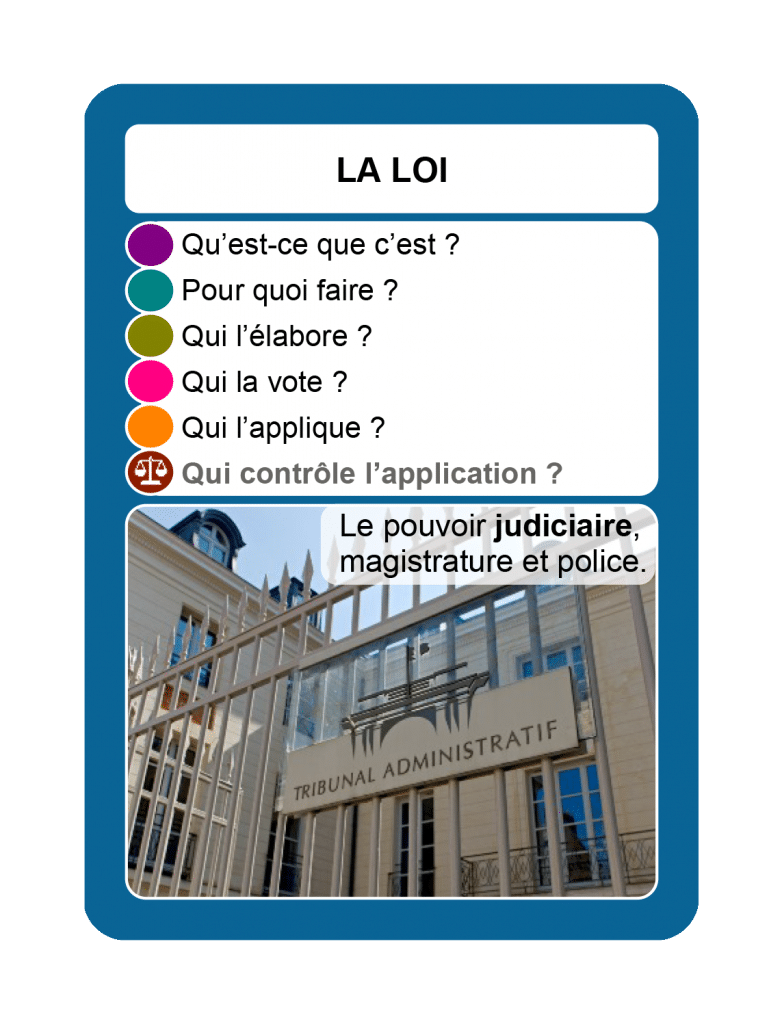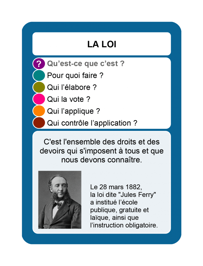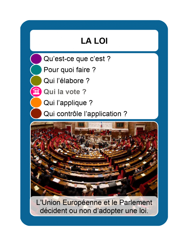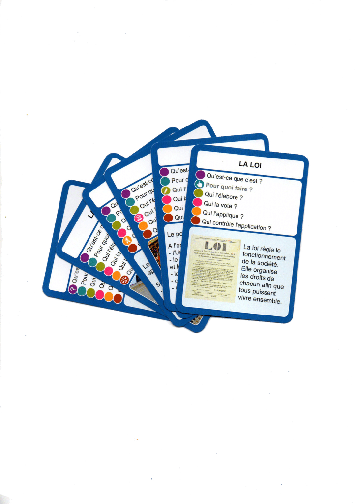 Les cartes répondent à des questions telles que Qu’est-ce que la loi ? Pour quoi faire ? Qui l’élabore ? Qui la vote ? Qui l’applique ? Qui contrôle l’application ?