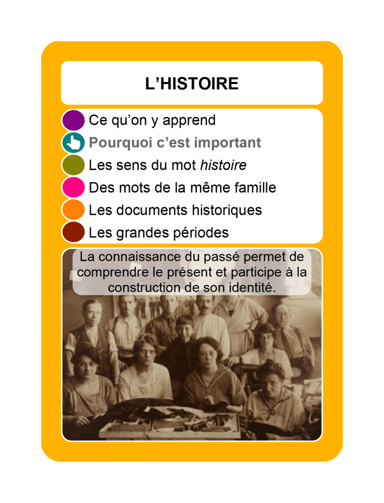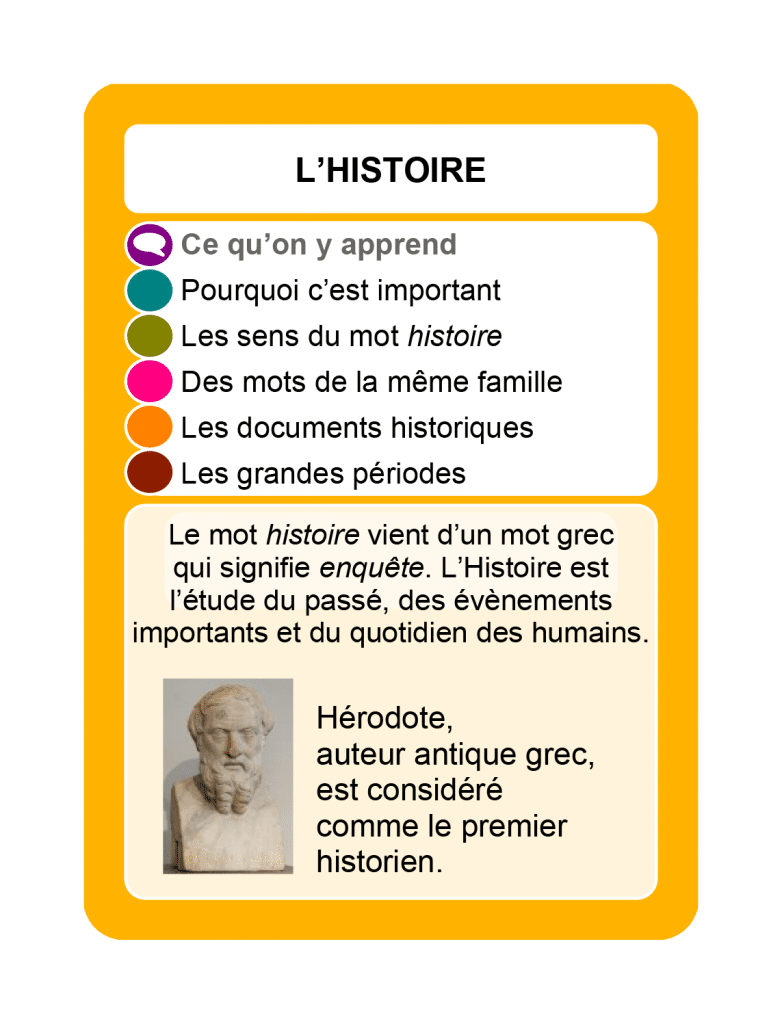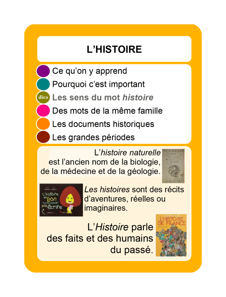 à partir du CE2, définir l’histoire, expliquer pourquoi c’est important, les différents sens du mot histoire, ce que sont les documents historiques et les grandes périodes.