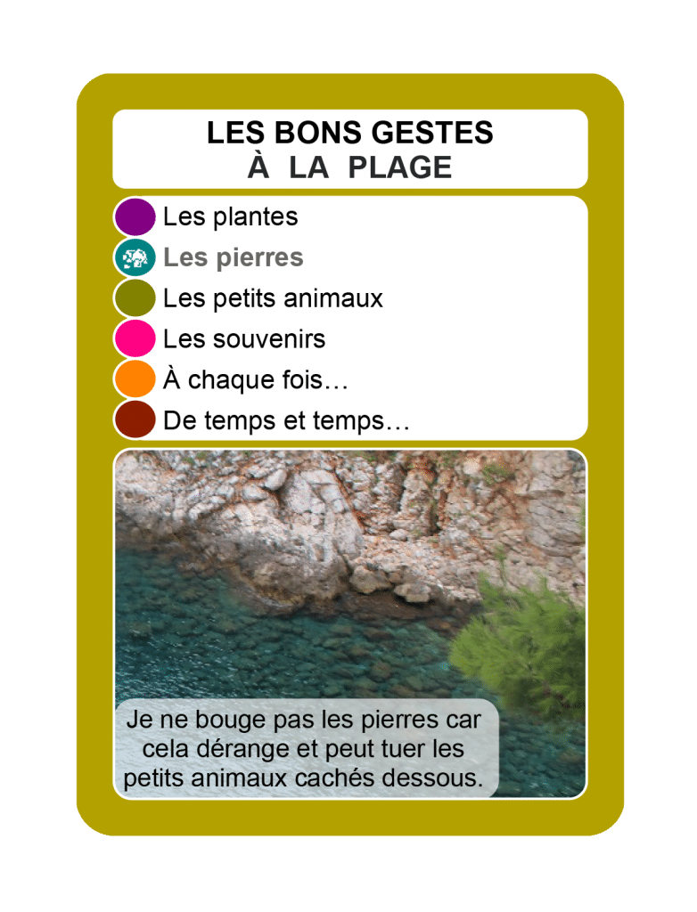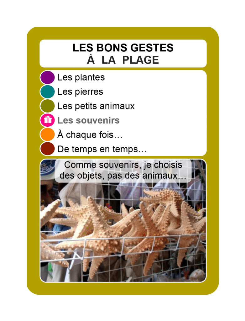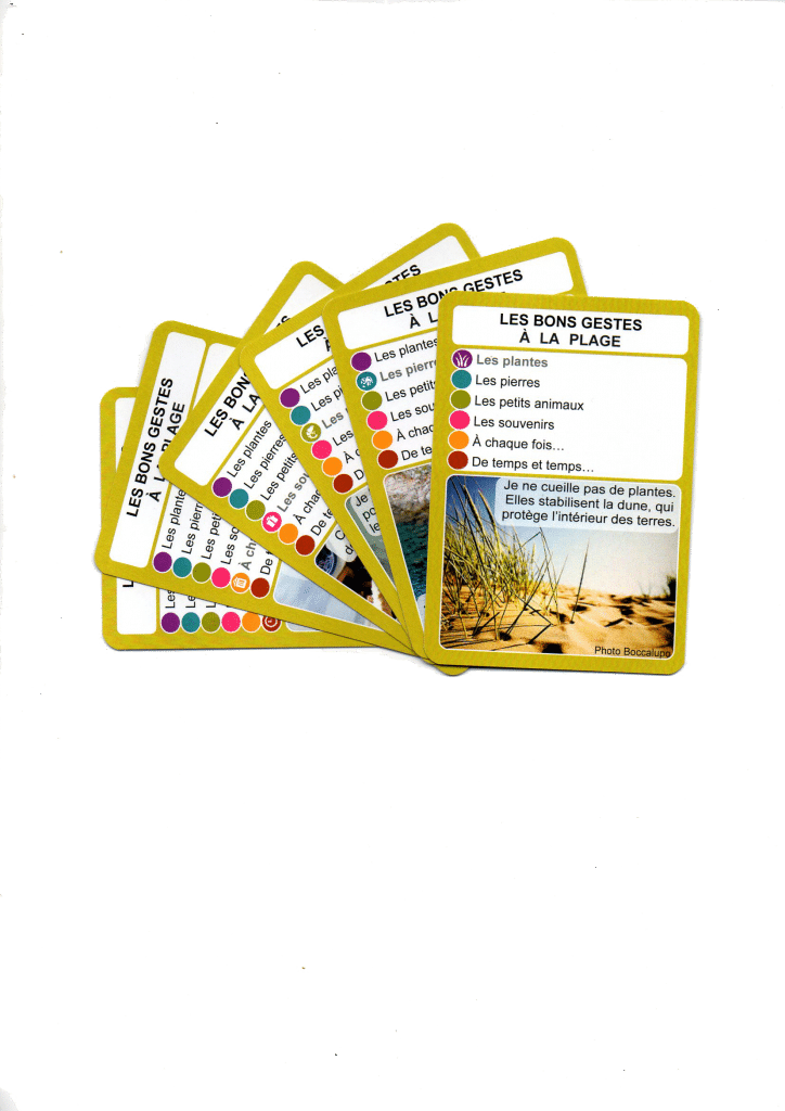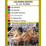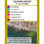 Fichier en deux page présentant les six cartes de la famille des bons gestes à la plage, à imprimer, plastifier et découper.