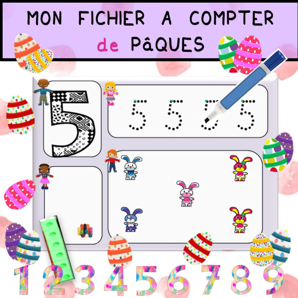 Ce fichier contient 9 plans de travail en couleurs ( 1 planche pour chaque chiffre) sur lesquels l’enfant doit :