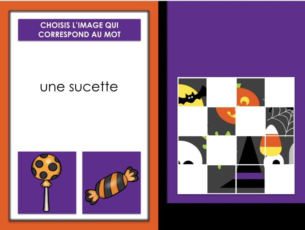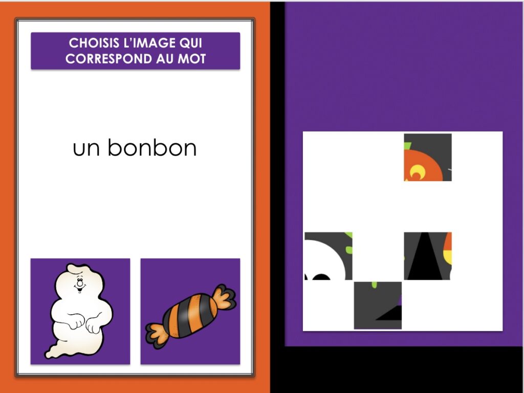 Jeu qui permettra à vos élèves de français langue étrangère de travailler le vocabulaire d’Halloween | Activité de lecture et jeu auto-correctif
