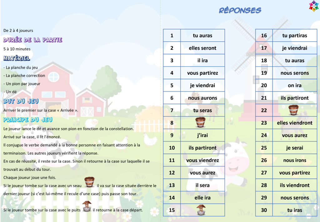 Vous recevrez un plateau de jeu accompagné d’une page de réponses, offrant ainsi aux élèves la possibilité de jouer en toute autonomie. Chaque plateau suit un schéma similaire pour instaurer une routine chez les apprenants et faciliter leur immersion dans les activités. Ces plateaux sont colorés et attrayants, ce qui rend l’apprentissage de la conjugaison à la fois ludique et captivant pour les élèves. Chacun d’entre eux comporte des instructions simples sur la manière de conjuguer le verbe présenté.