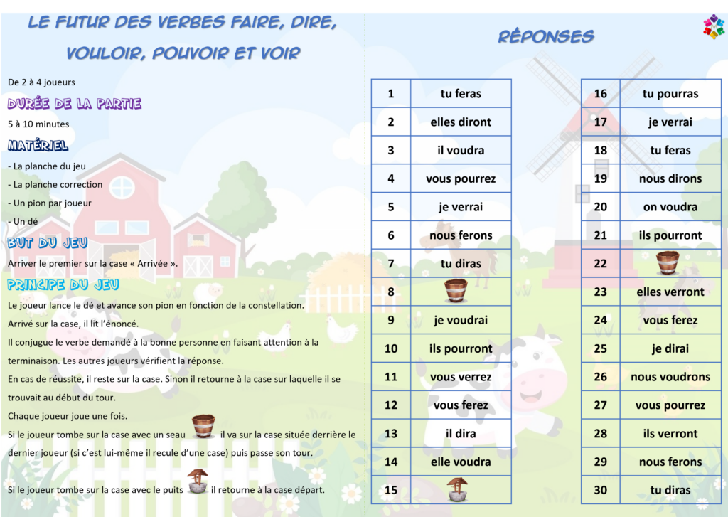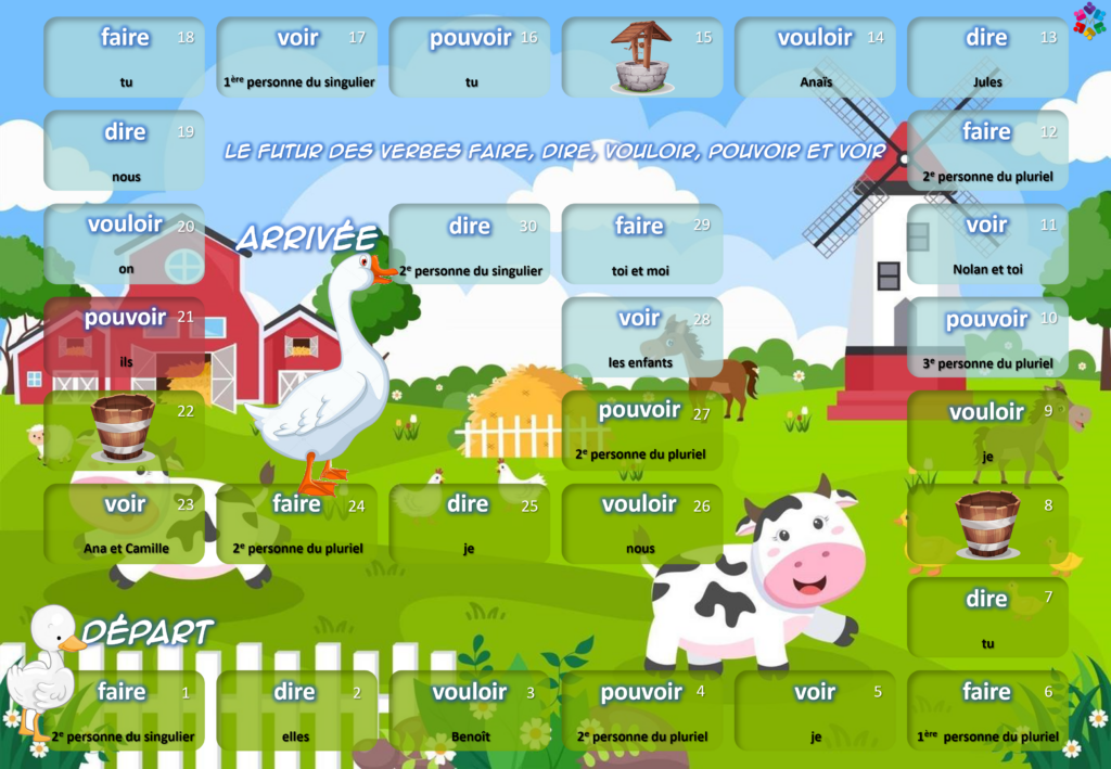 Jeu de plateau – Conjugaison – CE2/CM – Le futur des verbes faire, dire, vouloir, pouvoir et voir