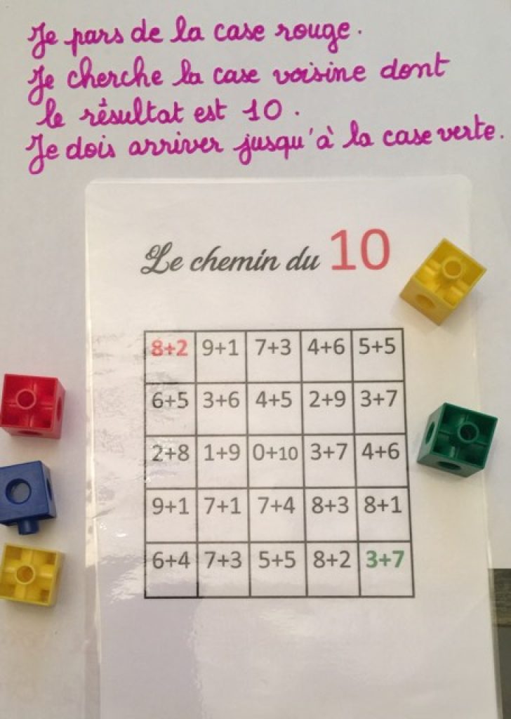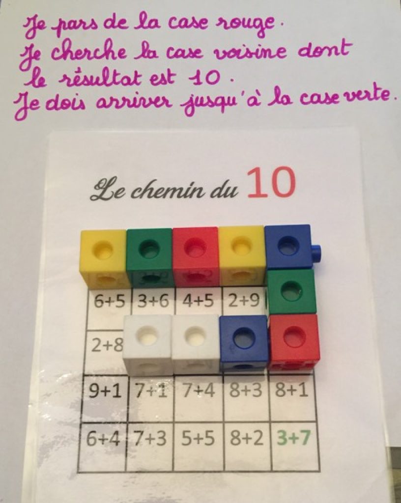 La somme est égale au nombre de référence de la fiche, il s’agit du bon chemin, je pose le cube dessus ou je colorie la case (dans le cas d’une utilisation sur photocopie).