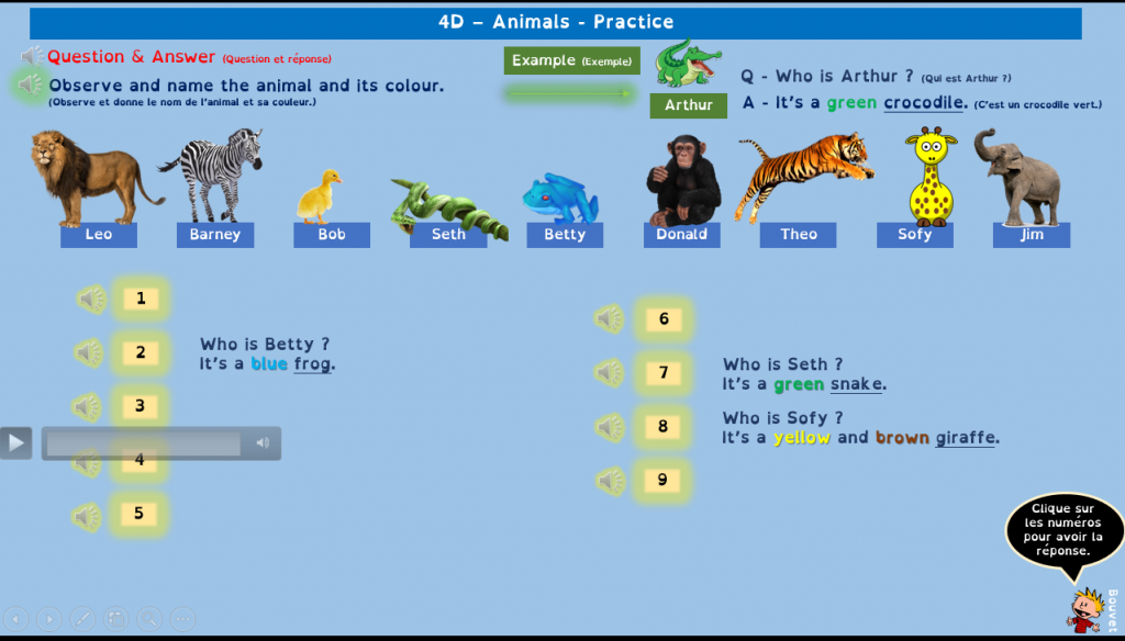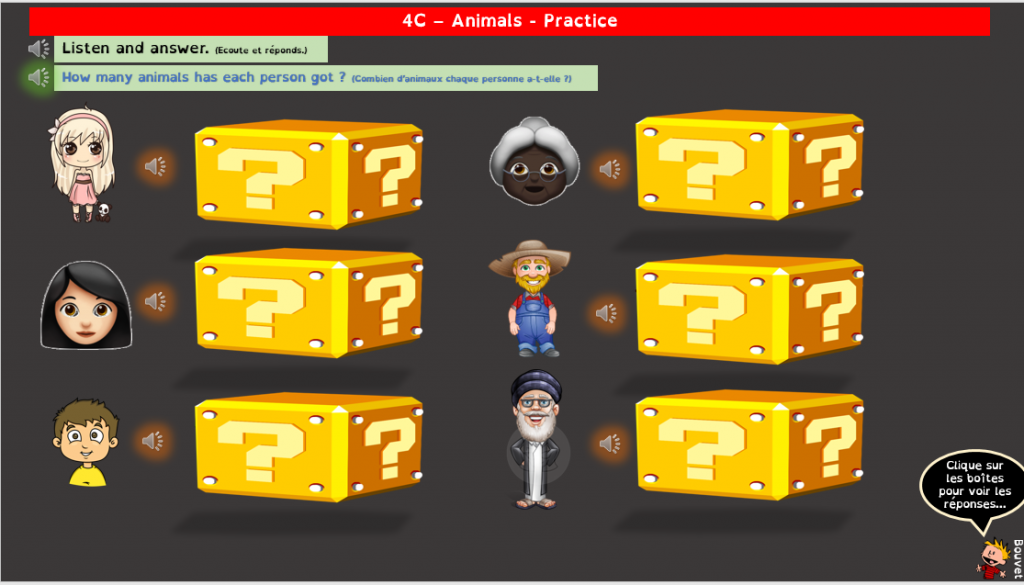 Pour les compréhensions orales, c’est aussi envisageable en groupe classe divisé en équipes qui, selon les activités, répondent soit sur ardoise soit en questionnaire de rapidité.