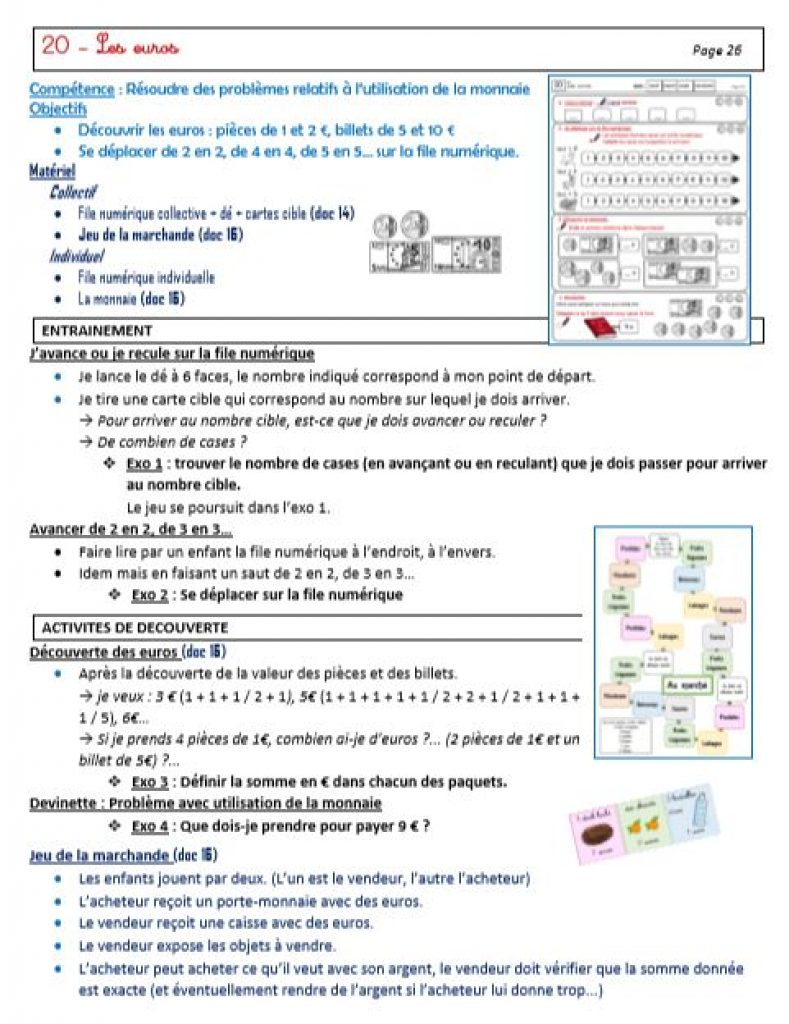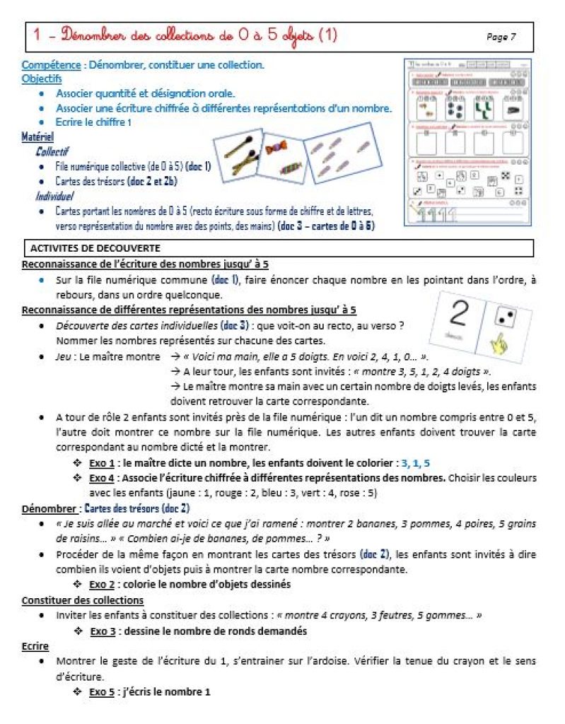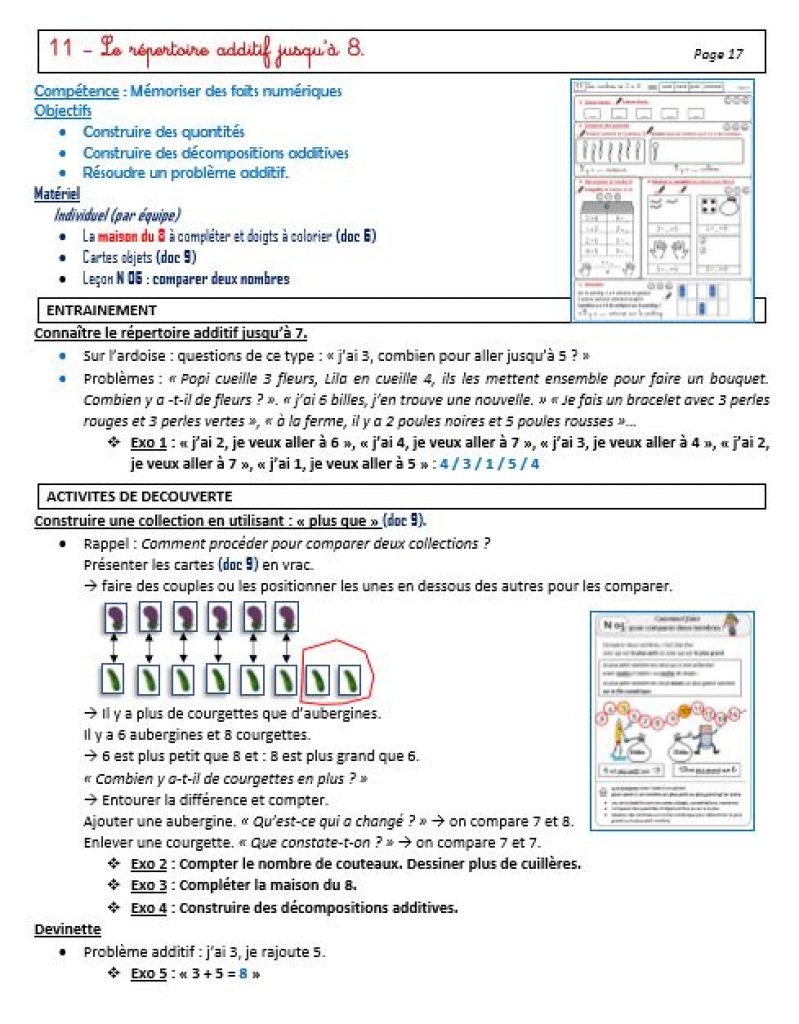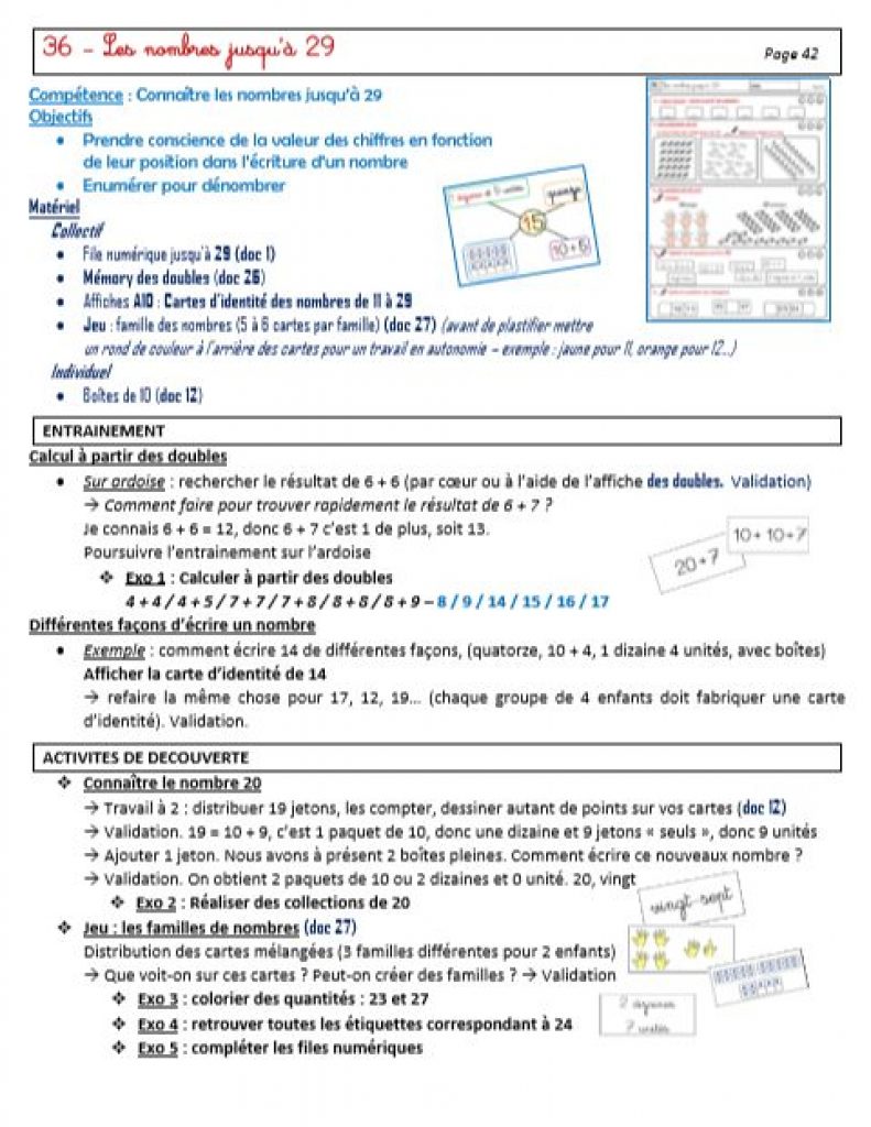 Chaque séquence de travail est expliquée avec en amont des fichiers de travail pour l’élève, des pistes de découvertes collectives, des jeux à mettre en place (qui seront ensuite disponibles pour un travail en autonomie), des leçons à coller dans un petit cahier (pour que l’élève garde une trace de ce qu’il doit savoir), des propositions d’affichages…
