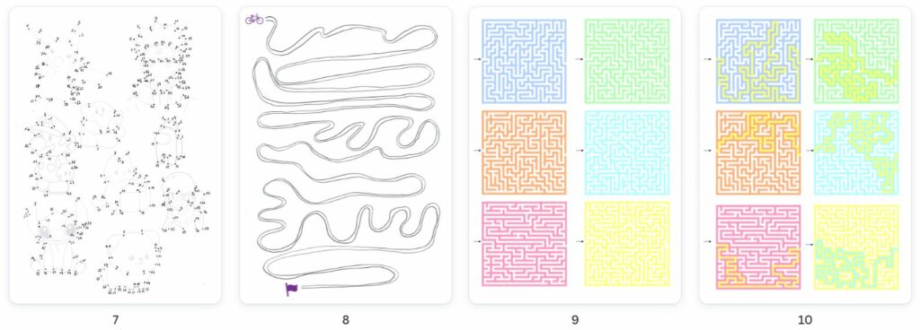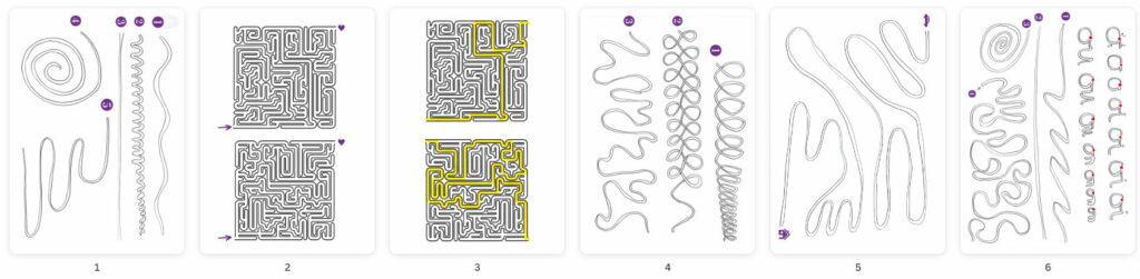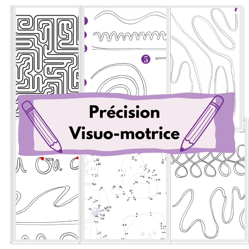 Petit livret de 10 pages pour travailler la précision visio-motrice (et/ou coordination oeil-main), avec des chemins, des labyrinthes, du pré-graphisme.