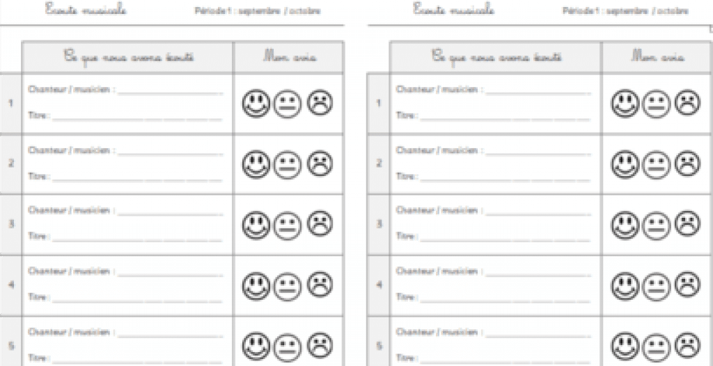 - Ce que permet cette ressource ? Grâce au fichier, vos élèves pourront garder une trace écrite simple des écoutes musicales réalisées en classe (chanteur / musicien, titre écouté) et pourront y noter leur ressenti à l’aide de petits bonhommes à colorier (vert, jaune, rouge,par exemple).