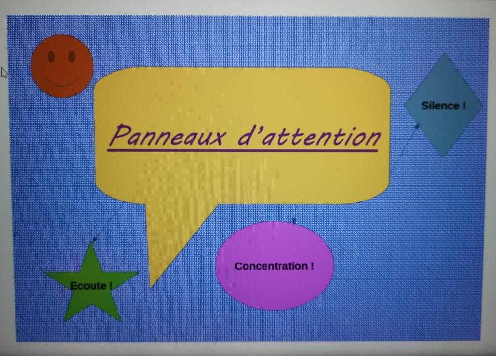 La réponse est simple : proposer un outil innovant qui a l’avantage de capter le regard et l’attention de chacun, à savoir la mise en place d’un système destiné à permettre aux élèves de s’investir à nouveau. Je vous propose ainsi des panneaux sur lesquels sont notés des messages courts et explicites. Il suffit de choisir une zone de consignes (par exemple le côté droit ou gauche du tableau) et de lever le panneau approprié.