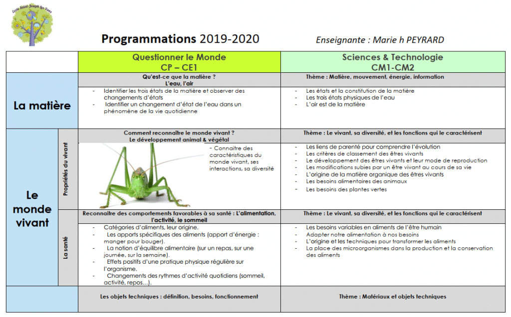 A noter : le partage du programme pour certains domaines, étant donné plusieurs niveaux dans la classe.