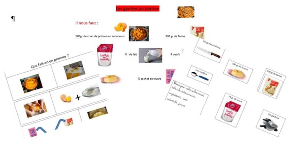 Vous trouverez la recette illustrée sur 3 pages A4 à distribuer aux enfants, différenciant les ustensiles à prévoir et les ingrédients à préparer