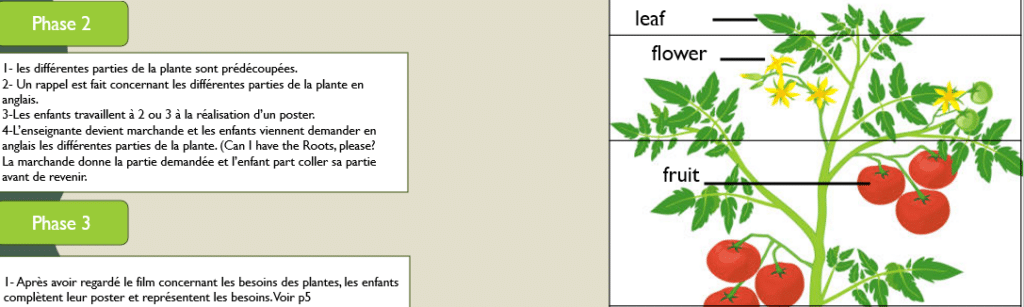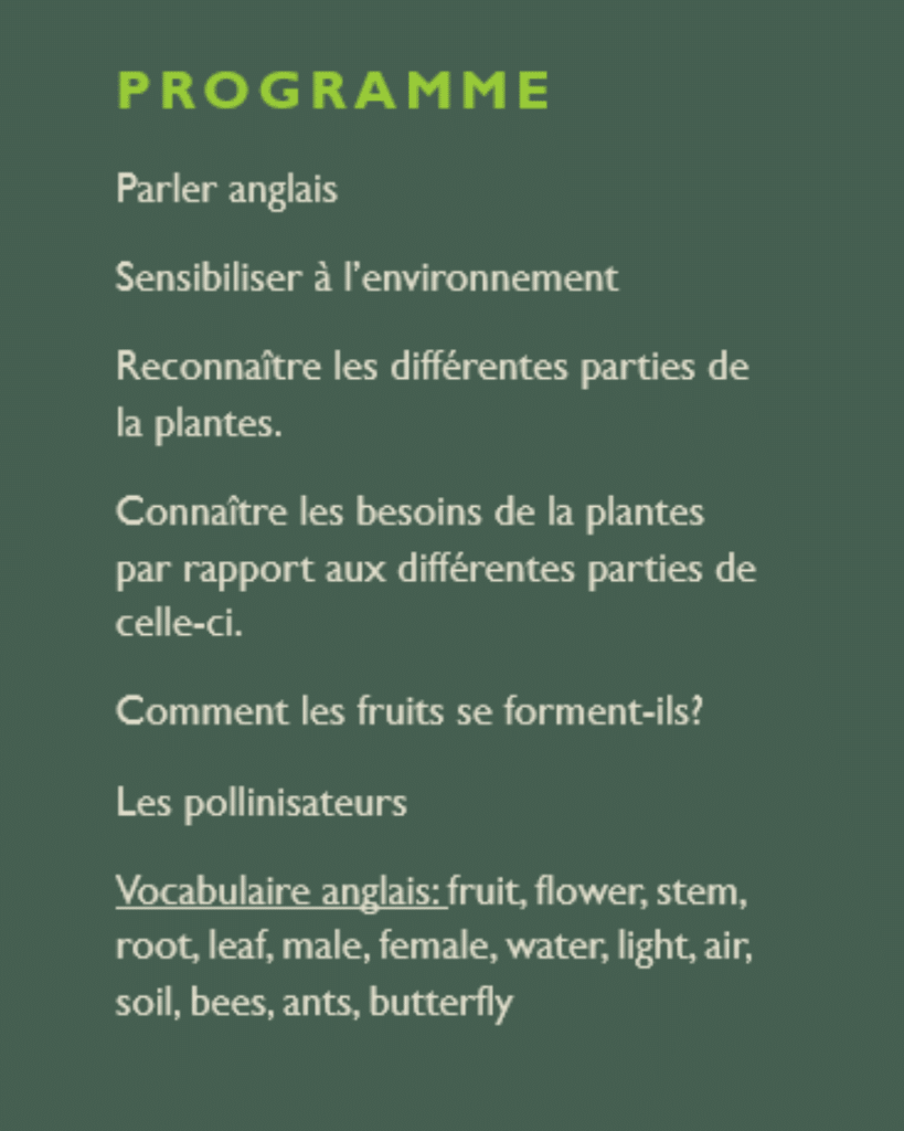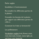 Vocabulaire anglais : fruit, flower, stem, root, leaf, male, female, water, light, air, soil, bees, ants, butterfly