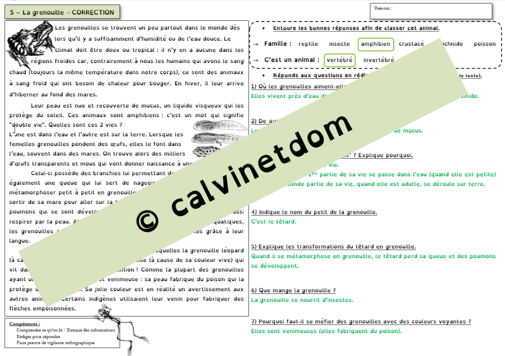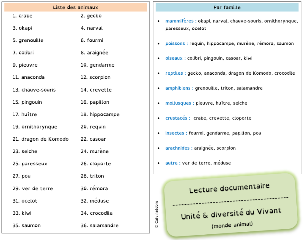 En plus de travailler la lecture compréhension et la rédaction de réponses écrites, ces textes ont pour vocation de varier les types de lecture, ils emploient en effet le vocabulaire spécifique de la classification animale.
