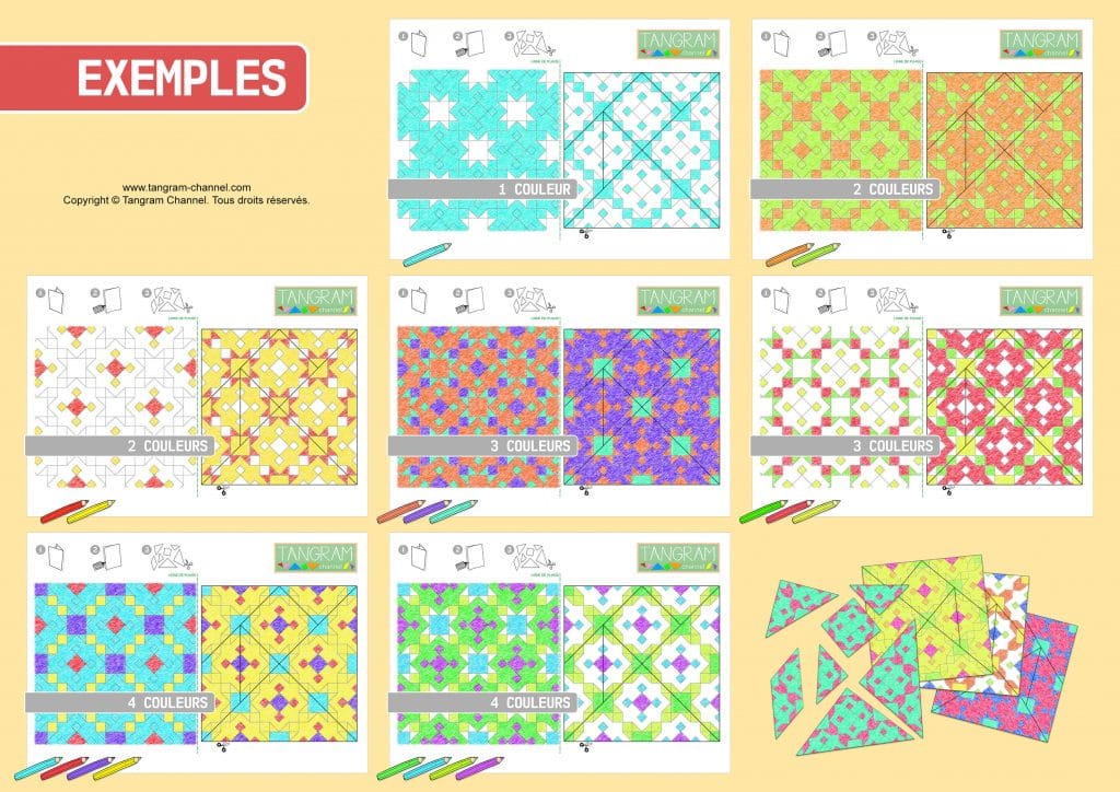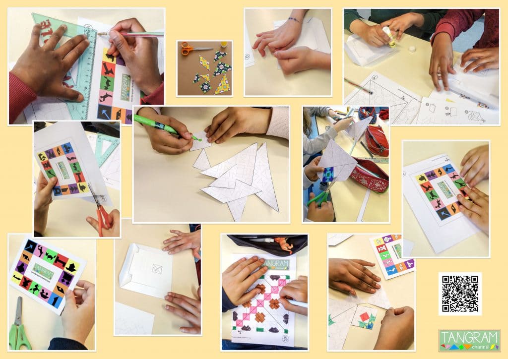 Comme on peut le voir sur les photos, cette activité simple de pliage, collage, découpage et coloriage permet à chaque élève de personnaliser son Tangram.